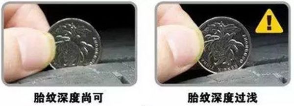 胎面花纹的厚度一定要大于1.6毫米,如果你经常驾车行驶在摩擦力低的湿滑路面上,最好能保证胎面花纹厚度是上述数值的两倍。你可以学习专业人士,购买一个计量器来测量胎面花纹的厚度;然而老驾驶员常使用一种广为流传的办法来大致估计胎面花纹厚度,那就是拿出一枚一元硬币,顺着国徽顶端方向插入胎面沟壑中, 因为硬币边缘到国徽顶端的距离在1到2毫米之间,所以如果这时还可以看到整个国徽标志,说明胎面花纹厚度已经不足。