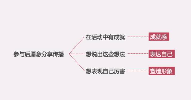 用户表达自己的原因,是希望证明自己是一个具备什么样形象的人,当你的活动能够赋予用户这种个人形象和地位的时候,用户的分享就无疑是在帮你做免费主动的传播。塑造的形象主要包括:有社会地位、有经济地位、有自己想法、懂爱情、懂友情、懂亲情。