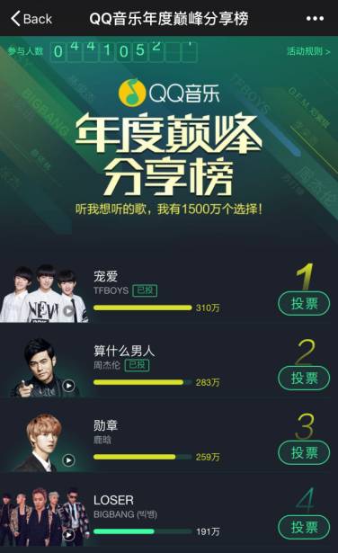 第一,这是一个功能清晰的页面,粉丝知道:这是QQ音乐推出的一个年度排行榜,我需要做的是让帮我家艺人上榜;