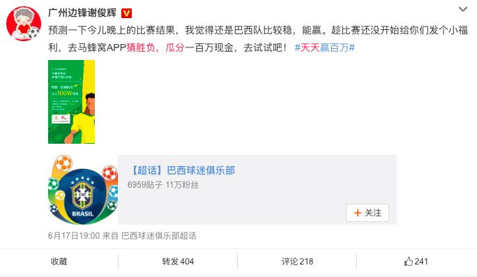前文提到了,分享免错卡不仅可以获得一次免错的机会,还可以获得分红奖励,使用你的免错卡下载马蜂窝并答题的用户,如果他猜对了本场球赛,你也可以获得一定比例的分红。这种赤裸裸的现金诱惑,促使有大量粉丝的KOL主动转发分享到自己的社交平台。