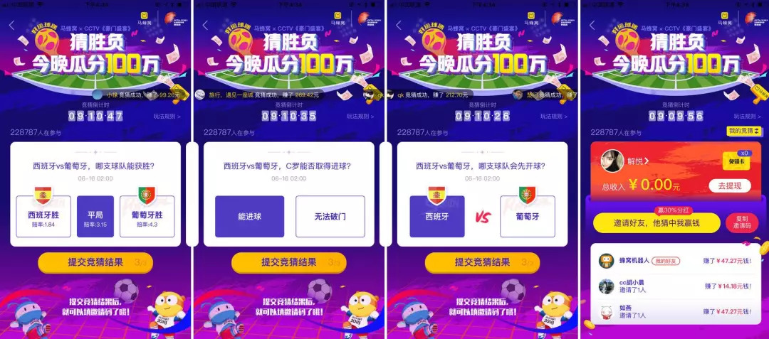 在活动页面有“XXX人在参与”“XXX竞猜成功,赚了XX元”的字样,直观刺激用户参与,增加了活动真实性。