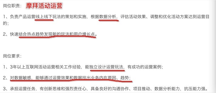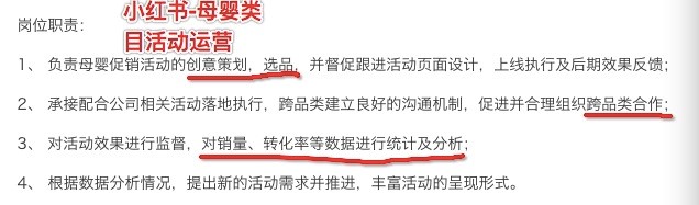照例我们从热门互联网公司的活动运营招聘JD(岗位描述)里去看看市场对活动运营的能力要求。以下分别是小红书母婴类目的活动运营和摩拜单车的活动运营JD。