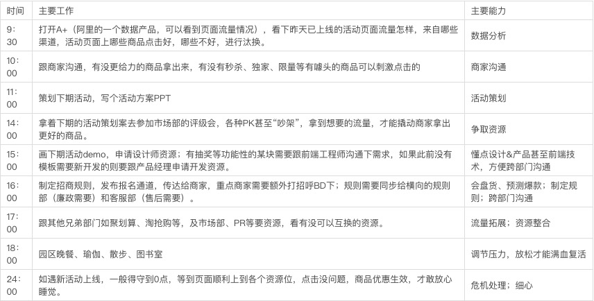活动运营一般处于上个活动还没结束,下个活动又要开始规划的紧张状态,始终营造网站内商气满满,充满购物欲的氛围。以前淘宝的资源位上没有那么多智能化的商品推荐,banner位大部分都靠活动填充,所以活动的频率高。活动运营的一天通常是这样的: