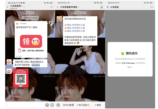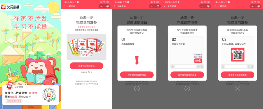 关注某个公众号→看到邀请有礼活动→输入手机号注册→分享海报→复制邀请语→分享→预约课程→领取讲义→通过小程序关注目标公众号→想要获取预约资格还需要接听销售电话