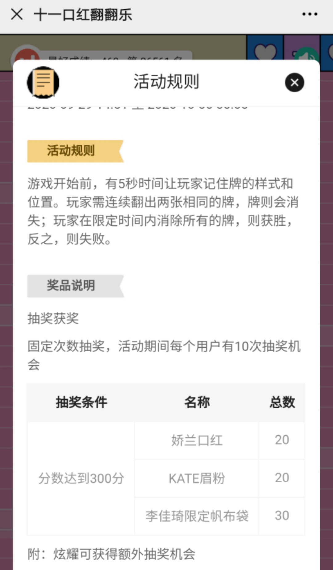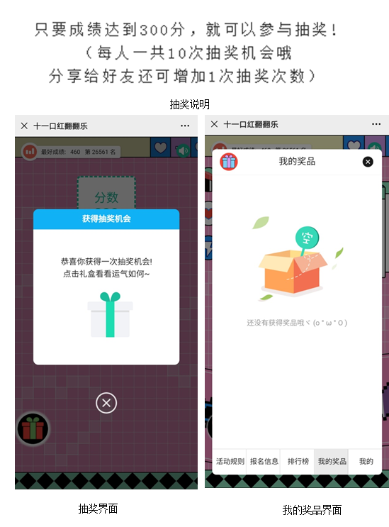 另外:用户如果达到300分后,就可以直接参与抽奖,如果没有中奖,用户可以通过“再玩一次”重新进入游戏,继续挑战。每个人都会有10次的机会。