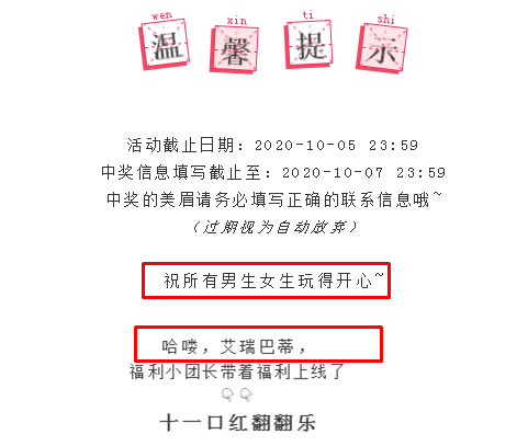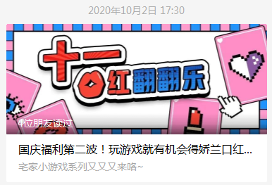 活动文案标题以“国庆福利”、“游戏”、“娇兰口红”等关键字作为诱饵,增加了用户注意力,吸引用户点击文案,并进入游戏参与抽奖。