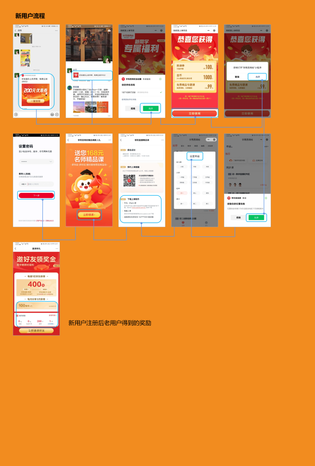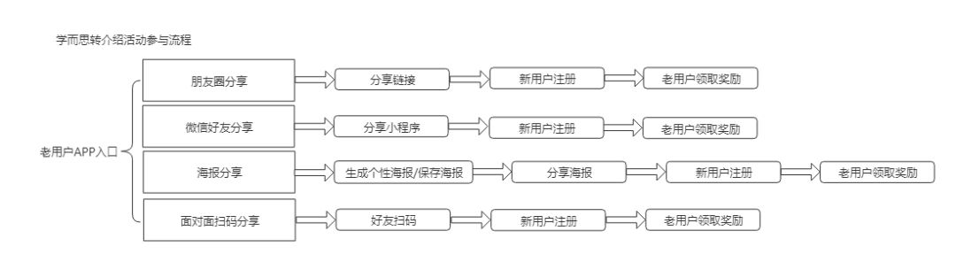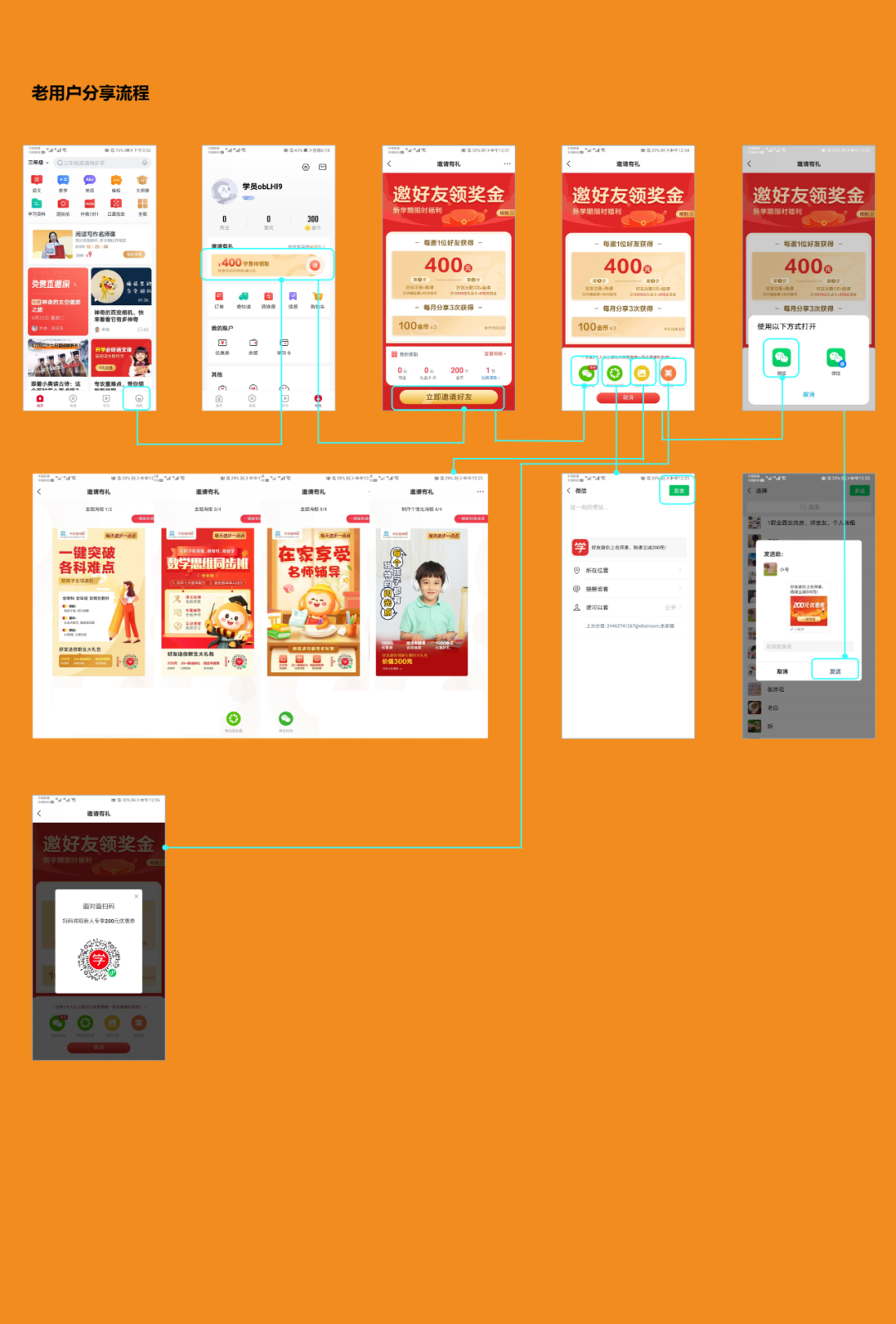 ②、用户旅程图:老用户在APP看到活动宣传,400元奖励,课程奖励等诱惑刺激用户愿意去分享。分享过程中用方便、丰富的设计流程留存住客户。邀请方式,可设置个性化专属海报,奖励进度、方式多样化。