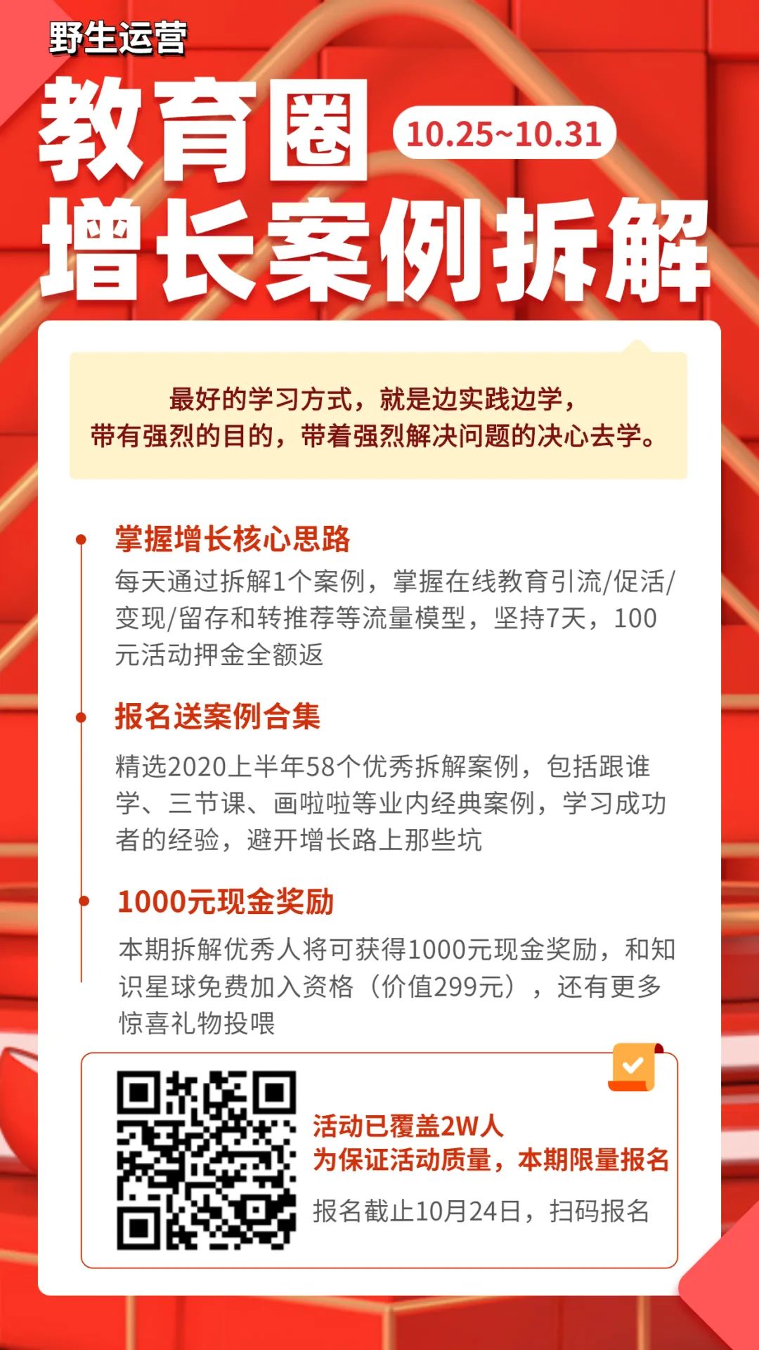 看了野生运营那么多案例拆解,只有自己动手拆解才能深入体验,并且通过不断的练习-实操-复盘,才能提升运营技能,本周日开启第 12 期教育圈案例拆解活动,为保证活动体验,本期依然限量报名,报名扫:
