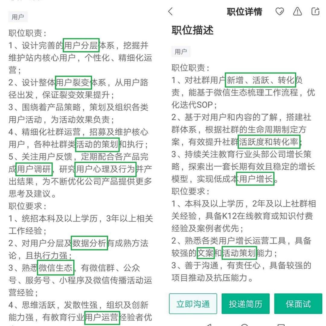 所以不必纠结于一个岗位的名称是啥,可能同一个岗位在A公司叫用户运营。在B公司又叫社群运营。每家公司的业务产品各不同,关注它具体的岗位职责就好了。