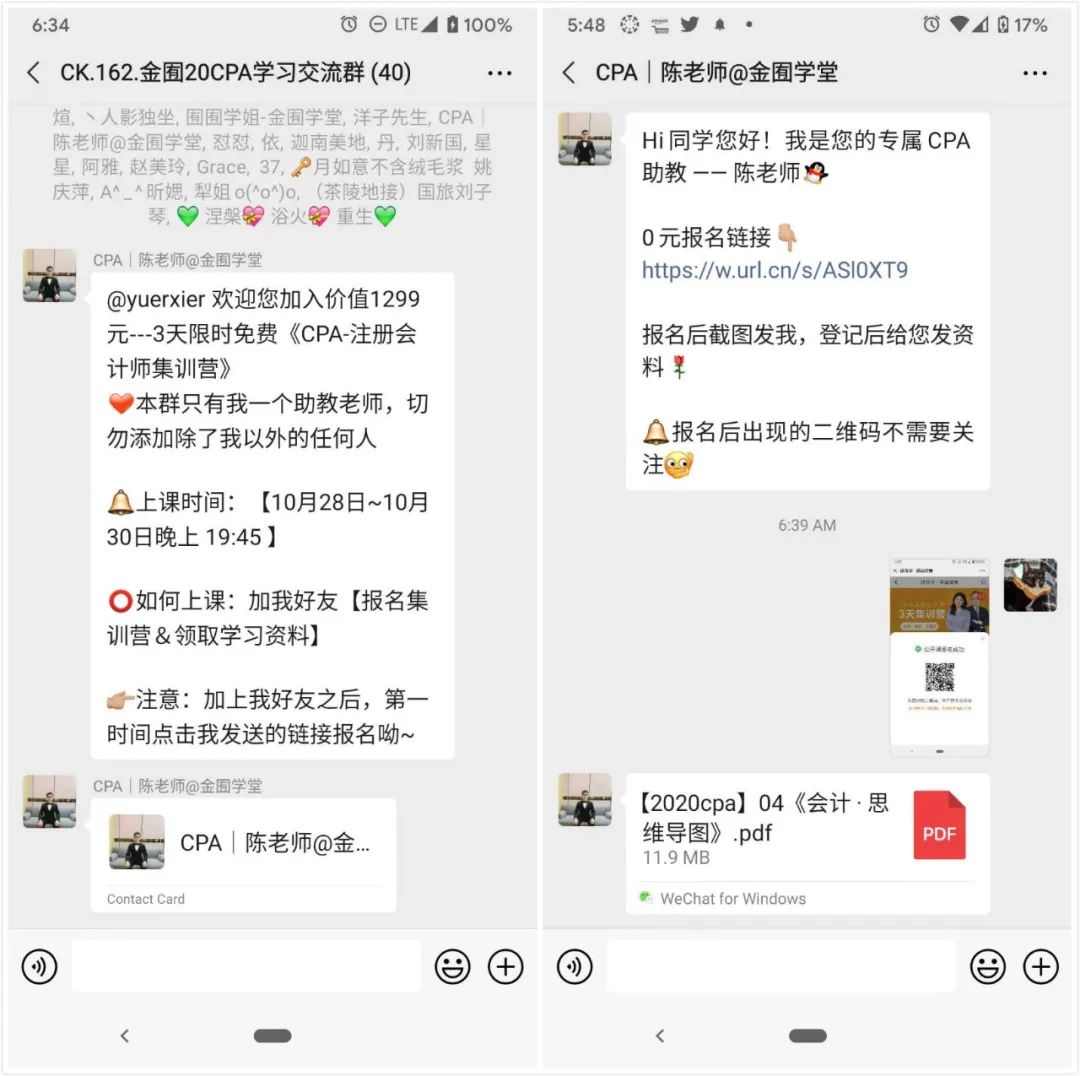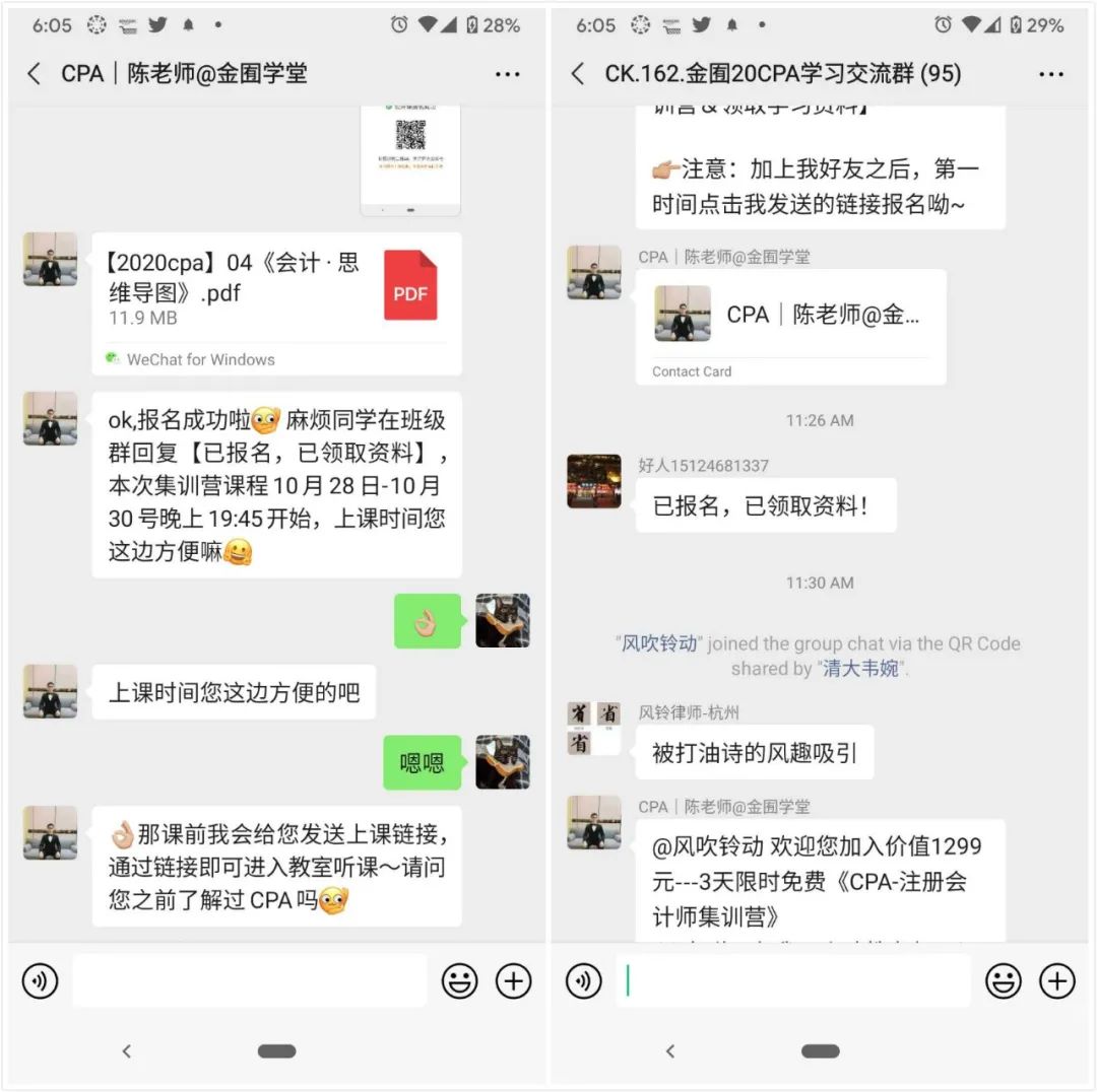 当发送完会计思导图资料后,助教老师便引导用户去学习交流大群发送【已报名,已领取资料!】来向其他新进群的用户展现群内的课程和资料的真实性,并且促使其他用户尽快联系助教并且完成课程报名动作。助教老师还会后续询问“上课时间是否方便”、“是否提前了解CPA”等。