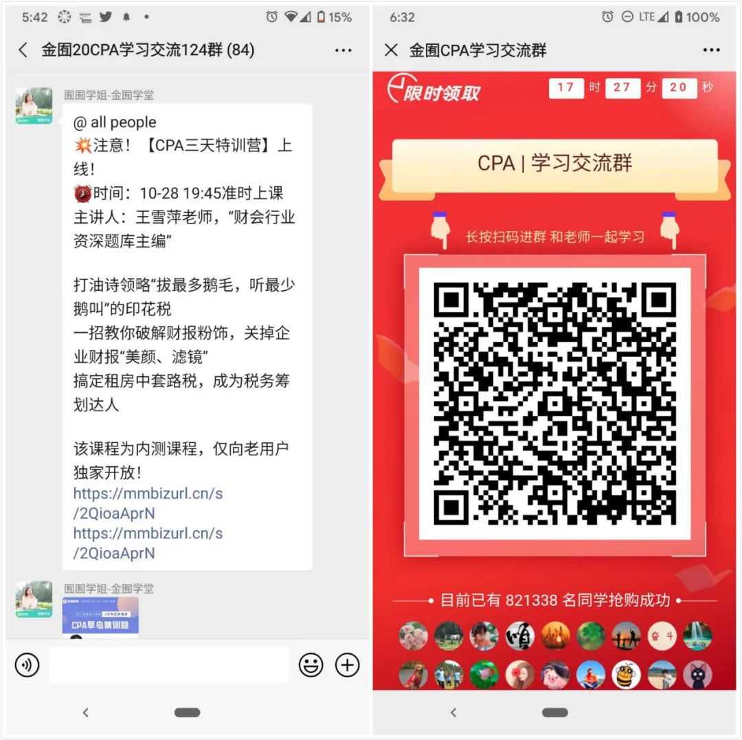 打开学习交流群,就可以看到最近的一次CPA三天特训营(体验营)在10月28日19:45开始,点击文本后的链接或者海报中的二维码扫描,即可到中转【CPA|学习交流群】二维码页面。页面元素主要是有引导词“长按扫码进群,和老师一起学习”,有紧迫感,右上角的限时领取和时间,底部显示已有821338名同学抢购成功。