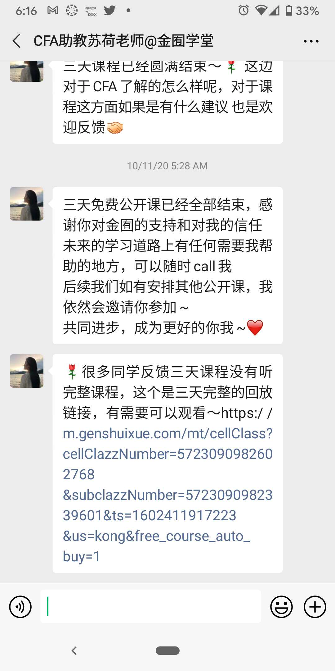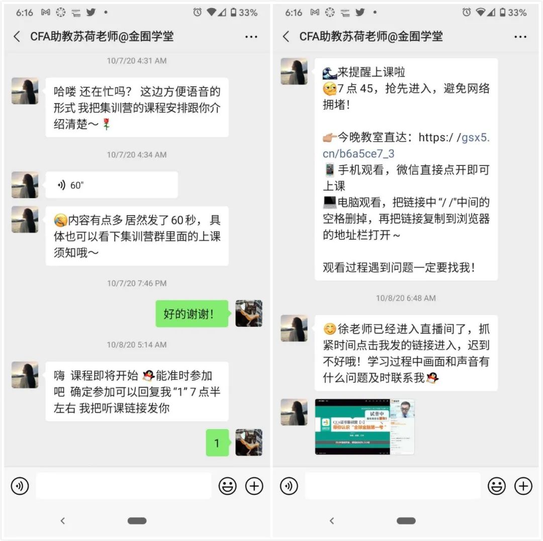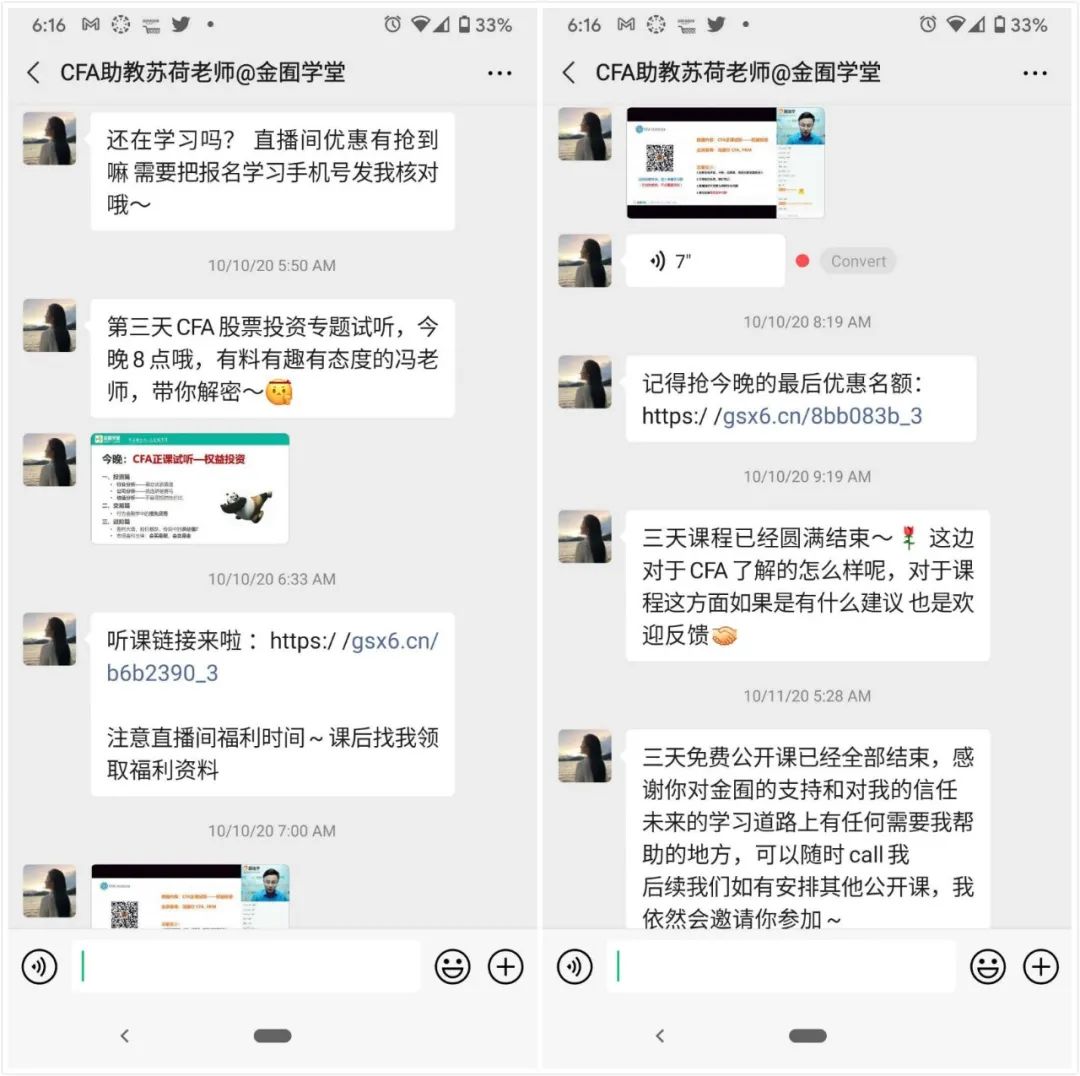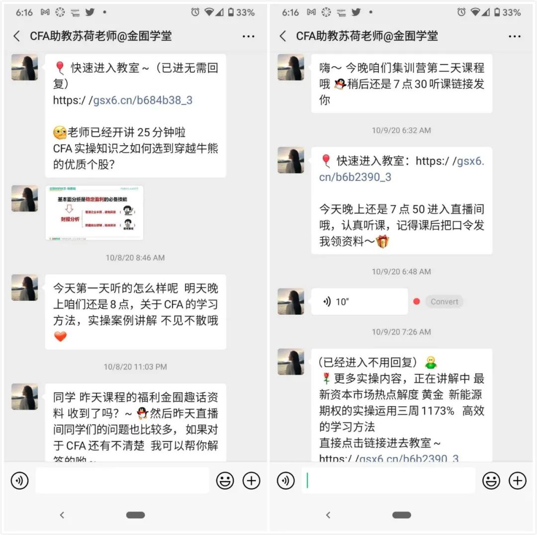 因为此CPA课程还没有开始,所以我先用10月8日CFA试听课的助教沟通截图还原下整个训练营的助教转化话术: