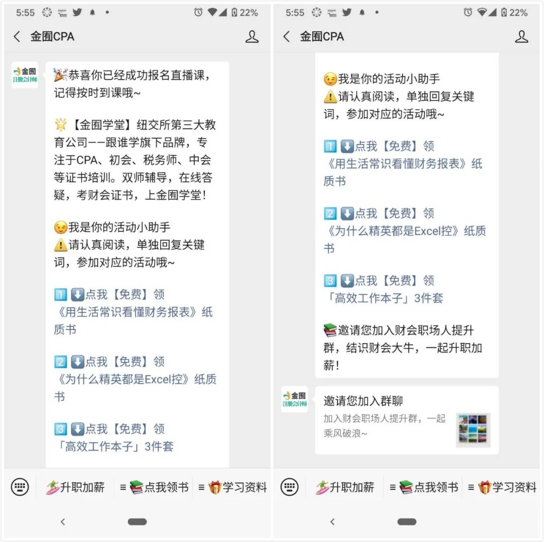 那为什么不让用户关注呢?原因就是除了这些以外,还会出现一个群邀请提示,而这个群却是一个新的群,会引导用户进入其他课前销售的群中。所以我个人觉得这是一个设置失误,这个闭环没有打造的很合理,如果能够引导到公众号,可以为公众号做引流,但是也会导致用户重复关注公众号(金囿学堂+金囿CPA),另外这个公众号内的群邀请也需要有所改动。这个问题,在我之前的CFA体验课时也同样如此。