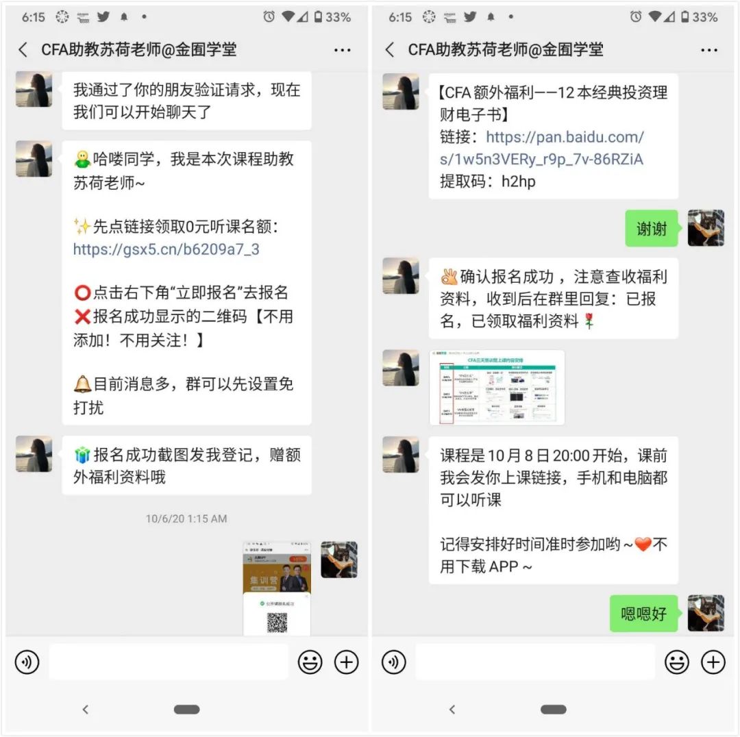 报名成功后赠送CFA电子书资料--去群内回复统一话术--发送三日课程的安排--再次提醒用户听课。