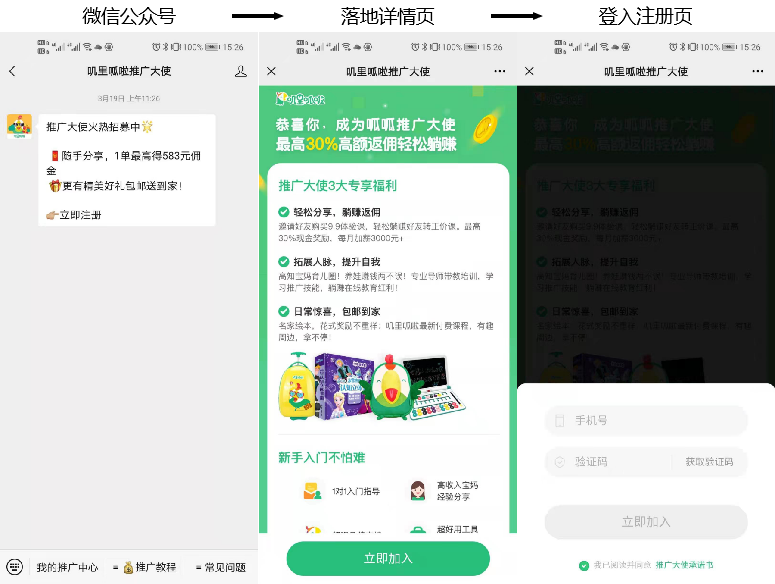 叽里呱啦拥有自建的分销系统,搭载独立微信公众号(叽里呱啦推广大使),利用微信公众号菜单栏作为分销端入口、活动发布入口以及规则制度说明等。