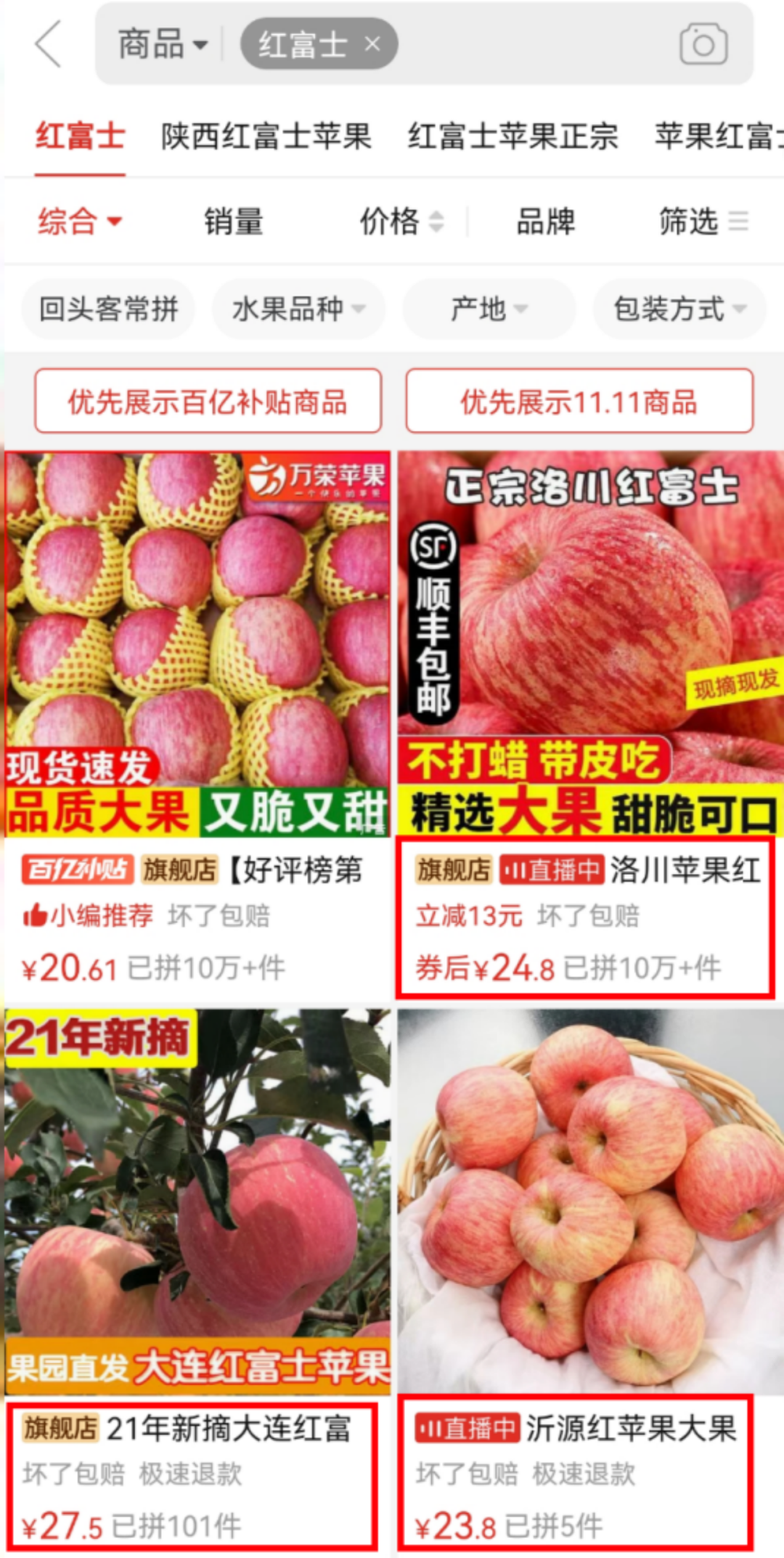 只要用户在搜索框中输入“新鲜苹果”,就能够得到超多“价低质优”的选项,醒目标注着 10 斤新鲜的红富士大果,只要 20 元左右。