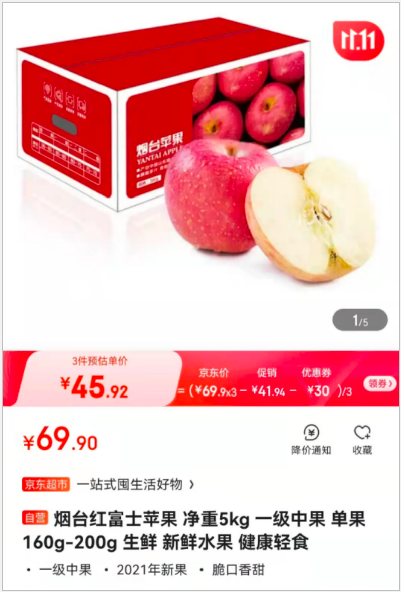 在其他网购平台,10 斤红富士苹果,双十一折后价也要五十多,是拼多多的 5 倍还多。