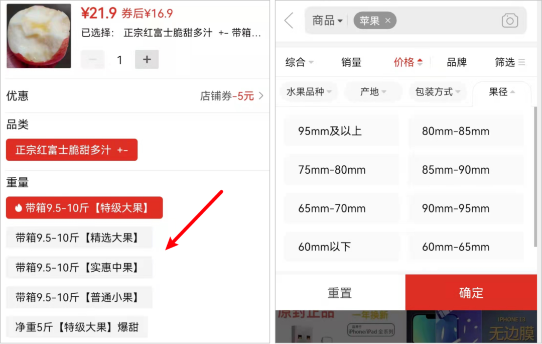 精确到具体品类具体产地后,用户还能够根据个人喜好筛选大果、中果和小果。