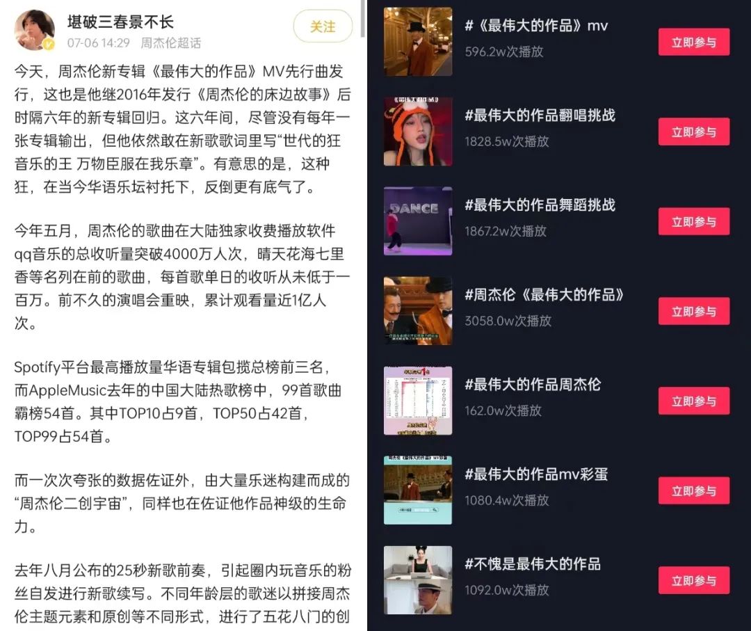 除了以上提及的三个独家平台,微博和抖音作为用户体量较大的平台,也同样承担了扩大热度的功能。在微博平台,除了热搜榜单话题定制,引导用户关注讨论,不少有影响力的自媒体大V也会利用微博的文字传达功能发布中长篇图文,在对周杰伦影响力的回顾和总结中引发大众共鸣,提升用户好感;在抖音平台,《最伟大的作品》相关“翻唱挑战”、“舞蹈挑战”、“变装挑战”层出不穷,抖音天然的bgm承载基因搭配与短视频适应度极高的多种类挑战,助推了歌曲的传播发酵。