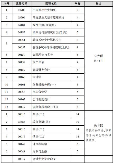 2、自考本科会计学的考试课程:中国近现代史纲要、马克思主义基本原理概论、英语(二) 、概率论与数理统计(经管类)、线性代数(经管类)、管理系统中计算机应用 、金融理论与实务、资产评估、高级财务会计、审计学、财务报表分析(一)、市场营销学、会计制度设计 、国际贸易理论与实务