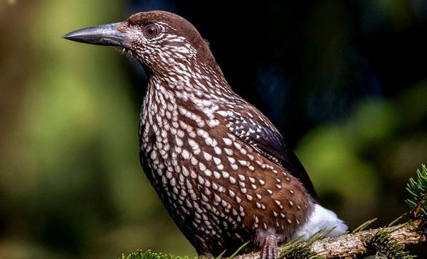 体羽呈咖啡色,具白色斑纹。飞行起伏而有节律,飞翔时黑翅,白色的尾下覆羽和尾羽白端很醒目。体上的白斑点飞行慢时易见。单独或成对活动,偶成小群。常栖于松林,以松子为食,会埋藏其他坚果以备冬季食用。