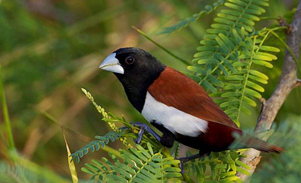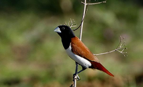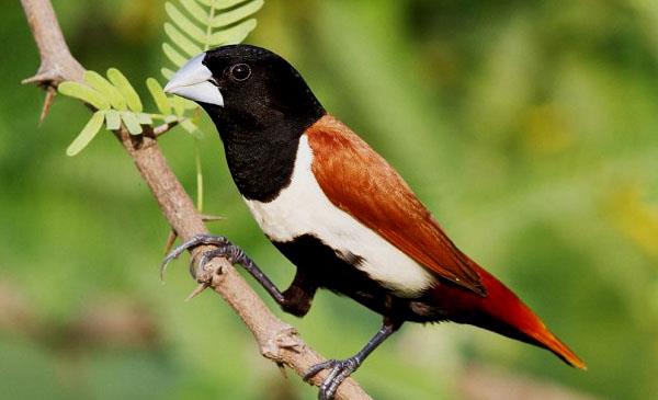 栗腹文鸟:别名,为雀形目、文鸟科、文鸟属鸟类,原产于亚洲中部及南部,包括中国、尼泊尔、印度、斯里兰卡、孟加拉国、缅甸、泰国、中南半岛、马来半岛、菲律宾和印度尼西亚等地。栖息于海拔1000m以下的低山丘陵和平原地带的灌丛、草丛和农田中,也见于果园、芦苇丛和村舍附近。1766年命名,共2个亚种。