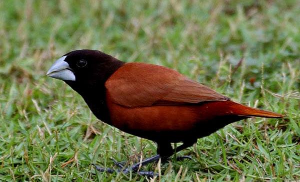 整个头、颈和上胸黑色,其余体羽栗色,并富有光泽。下胸和腹中央至尾下覆羽黑色,尾栗红色。背、肩和两翅覆羽淡栗色,腰和尾上覆羽深栗色。鸣声尖似笛声,飞行时常发出三声颤鸣。
