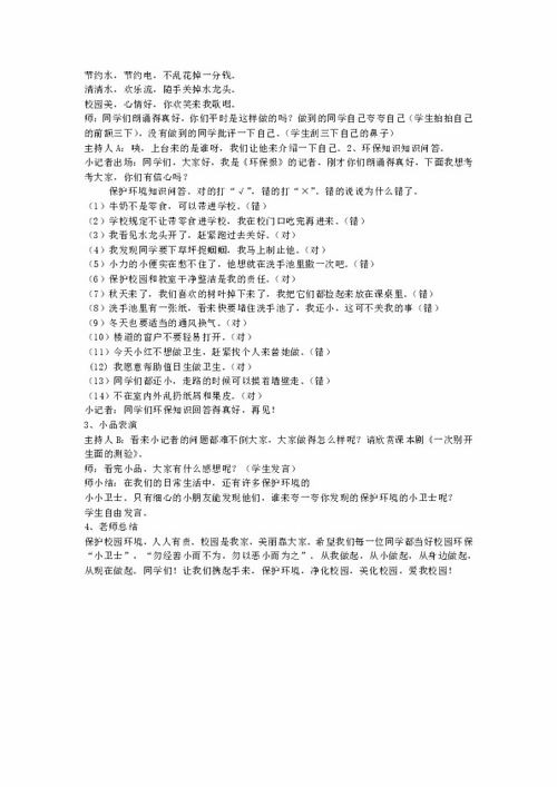 在生活中,还有很多环境保护的自觉行为:不践踏绿地;平时节约水电、节约纸张、爱惜粮食、不在墙壁或桌椅上乱涂乱画;不随地吐痰等等,这些都是环境保护的自觉行为,而且是每个人都能做得到的。第三,要争做环保小卫士,那怎样就算环保小卫士哪?比如:见到乱扔果皮纸屑的人就及时制止;见到用脚踢在我们雪白的墙上就让他立即擦掉脚印;看见进入花坛的同学就立即告诉他这样做的危害性等等,只要能做到这些你就是我们的环保小卫士了。