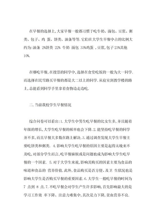 为了进一步了解学生吃早餐情况,我对经二路小学一至六年级同学吃早餐情况进行了调查。现将调查结果报告如下: 一、调查经过 记者:“甲同学,请问你吃早餐了吗?” 甲同学:“没有。”