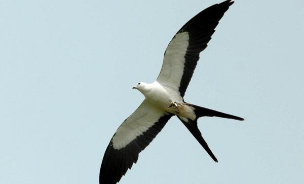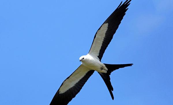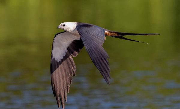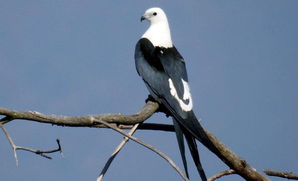 燕尾鸢:别名燕尾鹰_美洲燕尾鸢,为隼形目、鹰科、燕尾鸢属鸟类,原产于北美洲、南美洲大部分地区均有分布。野生于海拔2000m以下的低地雨林、沼泽、河流、草地边有高大树木的地方。在松林中建巢。1758年命名,共2个亚种。鸣叫声比较单调,繁殖季节,雄鸟发出的“克利-克利-克利”三个音节的声音,雌鸟则是一个音节的“克利”,并略显尖锐。这些发声许多场合都能听到,遇到天敌鸟类或和伴侣交配后,以及希望取得联系。迁徙性鸟类,在南美长途跋涉,春天它们返回佛罗里达州境内定居,此时已经形成对。